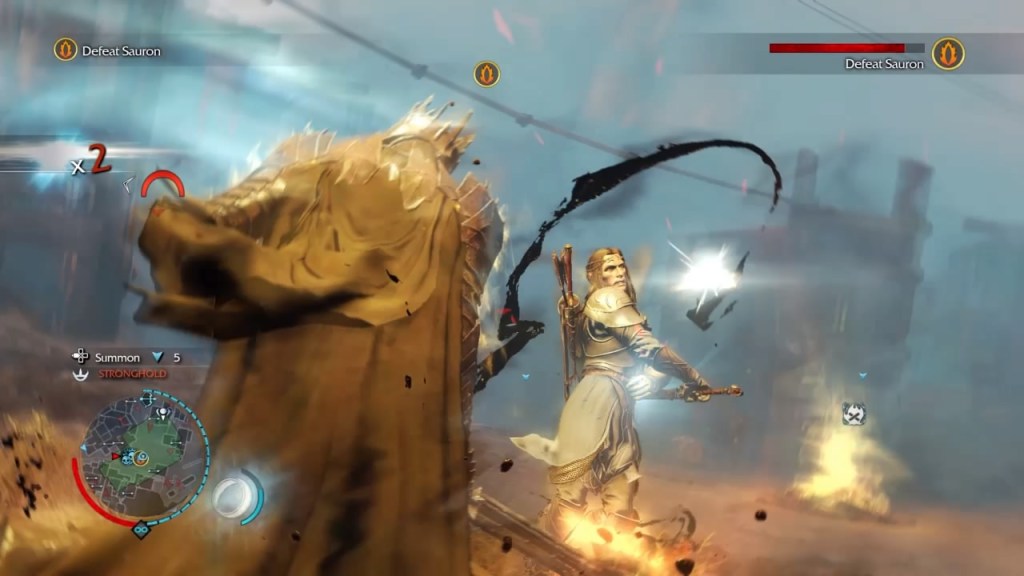 The fight against Sauron is tough and long. Why? Because Sauron deals heavy damage to you and your followers and you can only take him on when the One Ring is charged. Also, over the course of the battle the five war chiefs will stop fighting once they are down to a certain amount of health and later inconveniently turn against the ringmaker. Which means you now have to kill them, or rather let your followers do the killing.