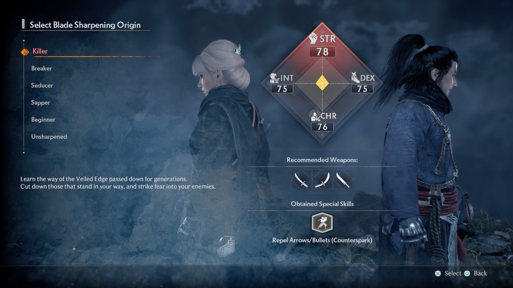 Our protagonist is of the Veiled Edge, an order of assassins. In the very beginning you will be able to customise your character and choose an origin. There are seven of them: Killer, Breaker, Seducer, Sapper, Beginner and Unsharpened. Origin comes with recommended weapons and stats.