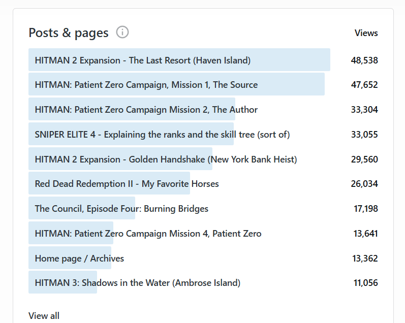 Speaking of: those specific walkthroughs are almost exclusively from the HITMAN-games, namely HITMAN (2016) and HITMAN 2 (2018). Here are the top ten most viewed blog-posts ever, and I am very proud that among those you can also find an indie gem like The Council. Surprisingly, a lot of people want to know about my favorite horses in Red Dead Redemption II…